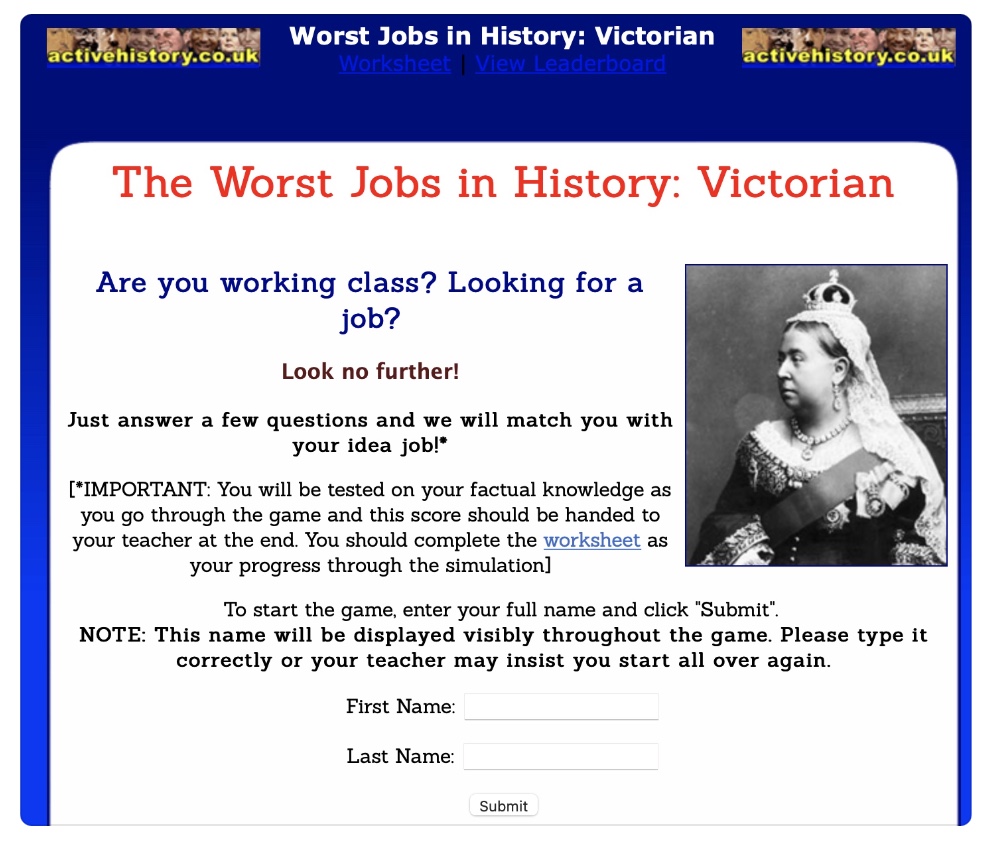 An interactive, self-contained game designed to teach students about some of the worst jobs available to young people in Victorian Britain. Simply answer a series of questions about your personality and preferences, and get a full description of your perfect working-class job. A workheet is provided - a great way of spicing up a unit on the Industrial Revolution!